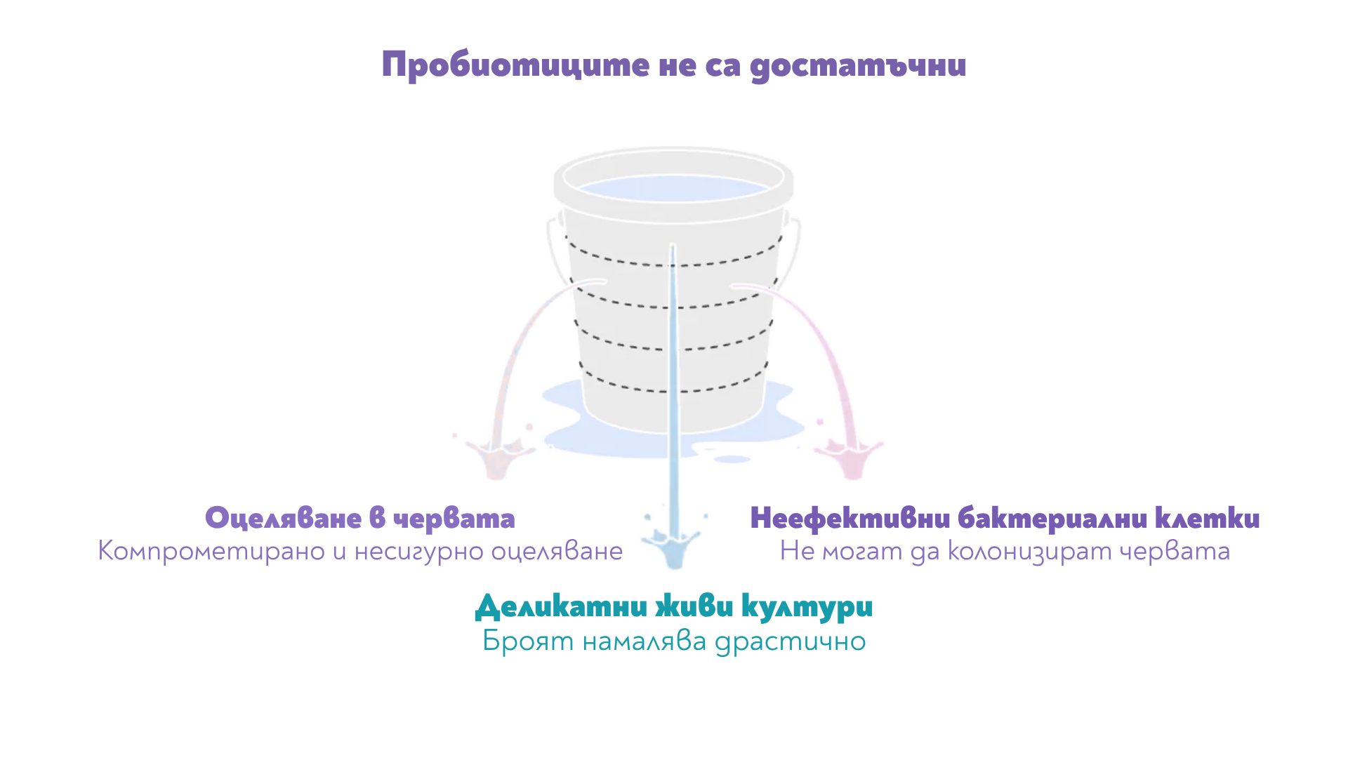 Пробиотиците, по дефиниция, са живи микроорганизми, които, приети в адекватни количества, носят ползи за здравето на гостоприемника. Проблемът е, че тяхната ефективност зависи изцяло от оцеляването им по пътя до червата, което често е компрометирано и силно несигурно. Тези живи култури са деликатни. Дори продуктът да напусне фабриката с 10 милиарда живи бактерии, докато стигне до вас и премине през стомашната ви киселина, броят им може да е драстично намалял. Много от стандартните пробиотици на пазара са по същество „мъртви при пристигането си”. Вие плащате за живи култури, но получавате неефективни бактериални клетки, които не могат да колонизират червата ви или да произведат полезните вещества, от които се нуждаете.