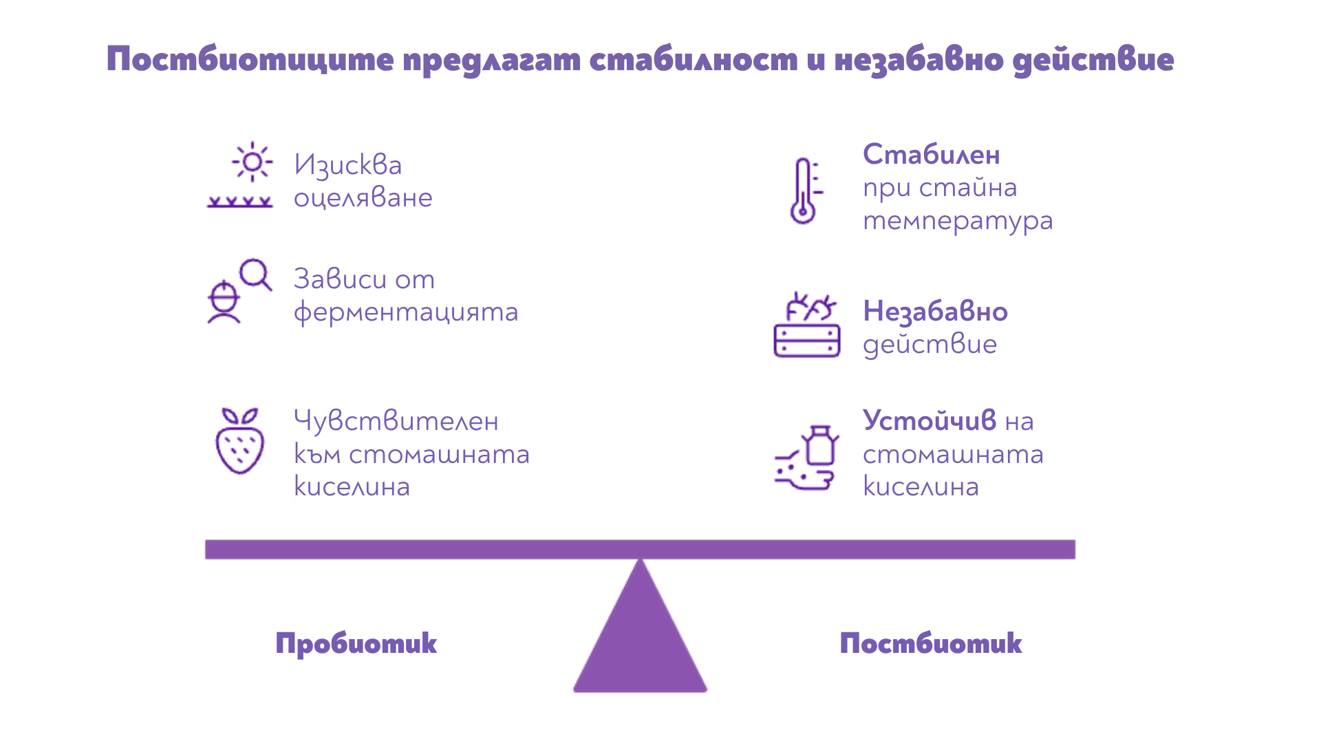 Както се вижда от сравнението, постбиотикът елиминира несигурността и осигурява надеждна, консистентна подкрепа.