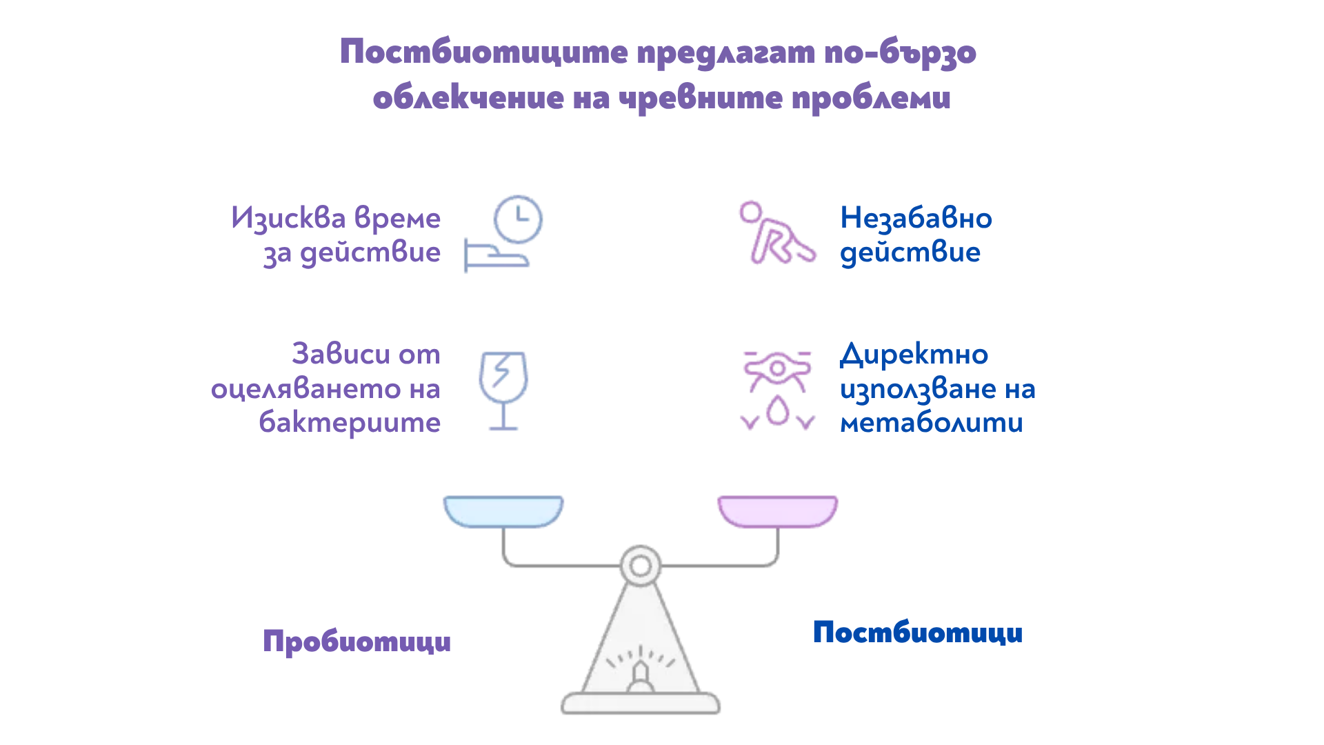 Да, постбиотикът може да бъде значително по-ефективно решение, защото той адресира проблема директно и незабавно. Вместо да чакаме живите бактерии от пробиотика да оцелеят, да се заселят и да започнат да работят, с постбиотика ние имплементираме крайния резултат от тяхната дейност – техните метаболити. Това е като да получиш готова реколта, вместо да садиш семена и да чакаш.