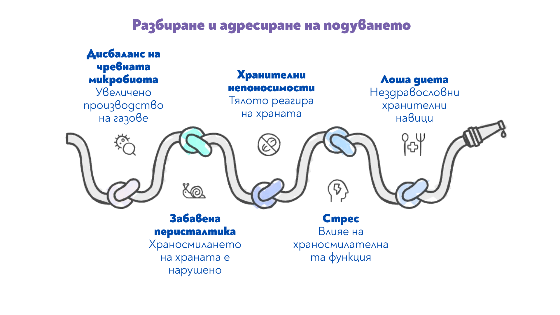 Когато балансът между „добрите” и „лошите” бактерии в червата се наруши, процесите на ферментация на храната се променят. Това води до повишено производство на газове като метан и водород, които раздуват червата и причиняват болка и дискомфорт. Други фактори включват забавена перисталтика, хранителни непоносимости (към лактоза, глутен), стрес и нездравословни хранителни навици. Ефективното сваляне на подут корем зависи от адресирането именно на тези първопричини.