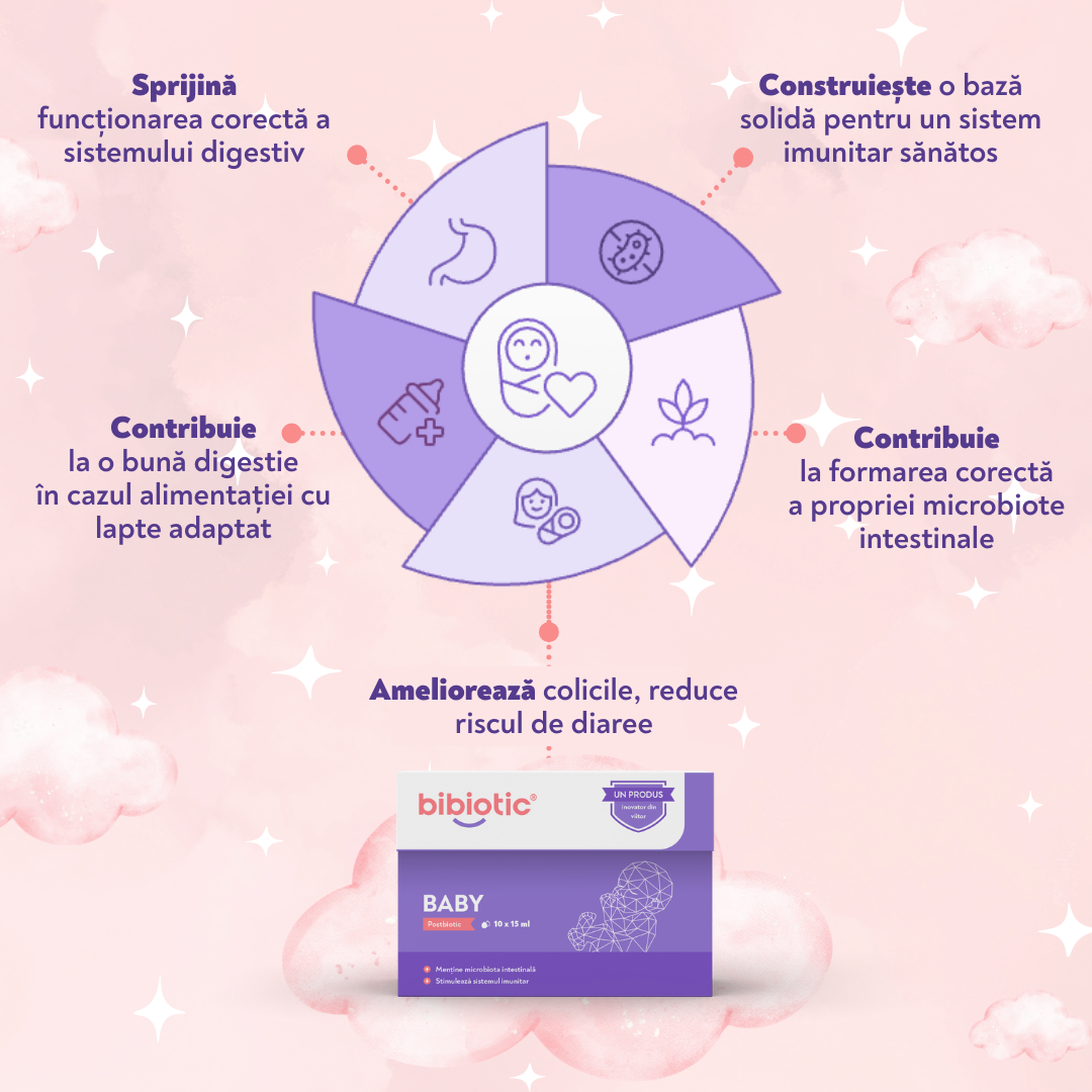 Bibiotic® Baby este un produs complet natural și sigur, care sprijină absorbția nutrienților și încurajează dezvoltarea unei flore intestinale sănătoase încă din primele zile.