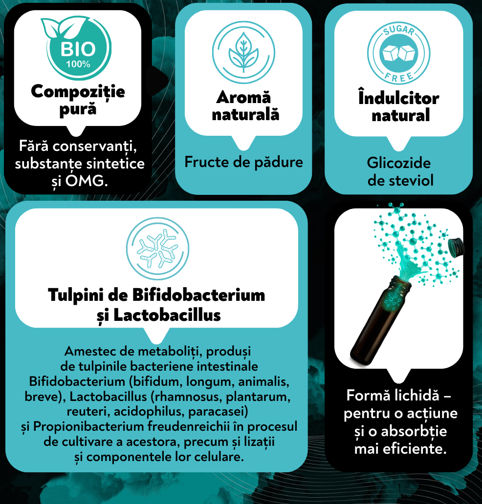Compoziție: Amestec de metaboliți produși de tulpinile bacteriene intestinale B. bifidum, B. longum, B. animalis, B. breve, L. rhamnosus, L. plantarum, L. reuteri, L. acidophilus, L. paracasei și P. freudenreichii în timpul cultivării, precum și lizatele și componentele lor celulare.