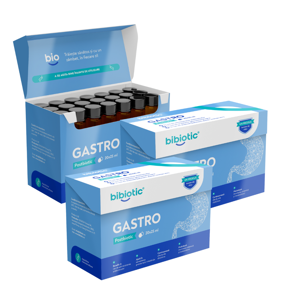 Bibiotic® Gastro este un supliment alimentar dezvoltat pentru menținerea funcționării normale a sistemului digestiv și pentru refacerea echilibrului natural al microbiotei intestinale. Postbioticul ajută la reglarea confortului intestinal, reduce senzația de greutate și balonare și susține mecanismele naturale de apărare ale organismului. Pachetul promoțional este ideal pentru îngrijire pe termen lung la persoanele cu probleme gastroenterologice exacerbate sau cronice.