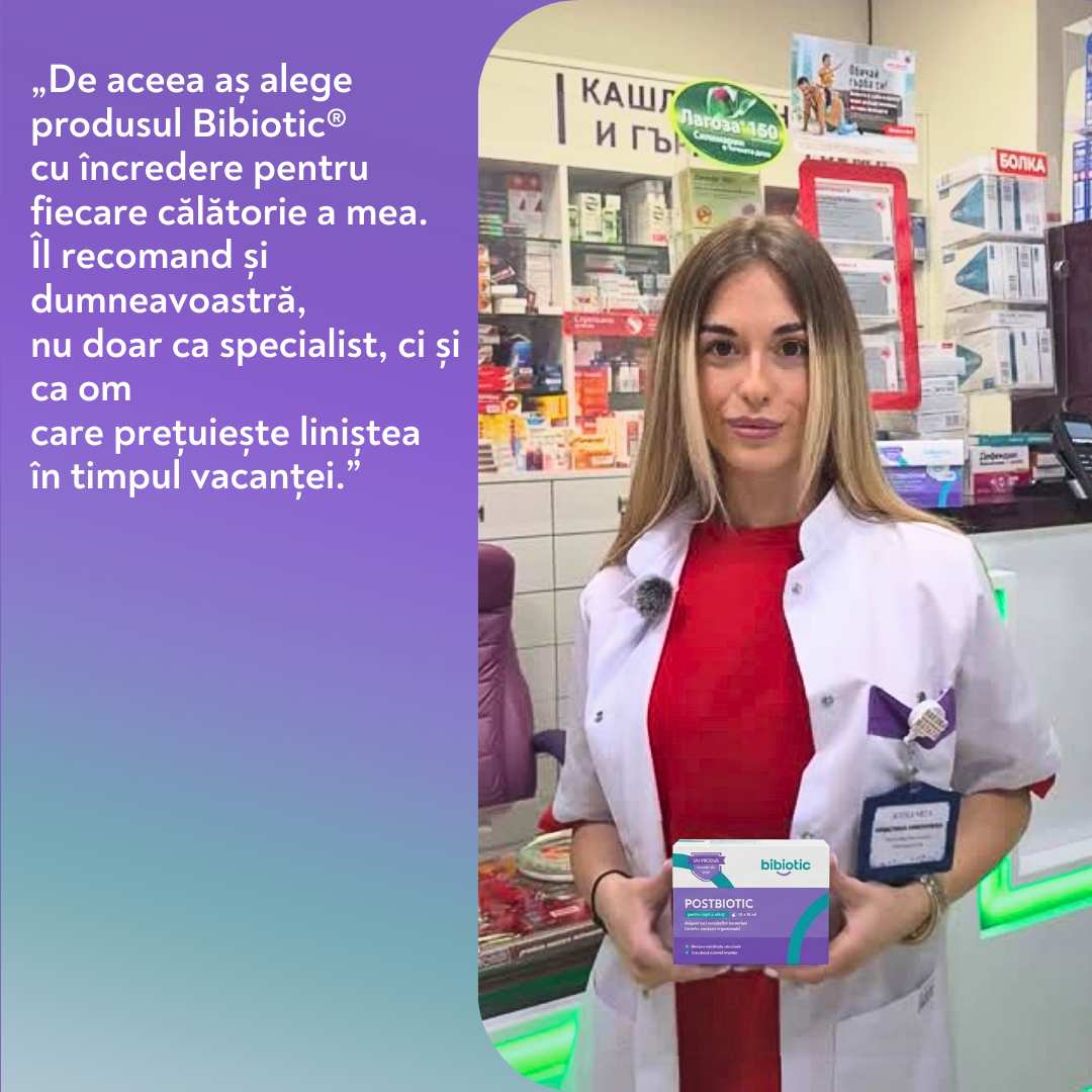 Spre deosebire de probiotice, postbioticul nu conține bacterii vii. Oferă direct substanțele benefice de care organismul are nevoie. De aceea, Bibiotic® pentru copii și adulți este extrem de stabil și complet sigur — poate fi păstrat la temperatura camerei. Puneți câteva fiole în bagaj și fiți pregătiți.