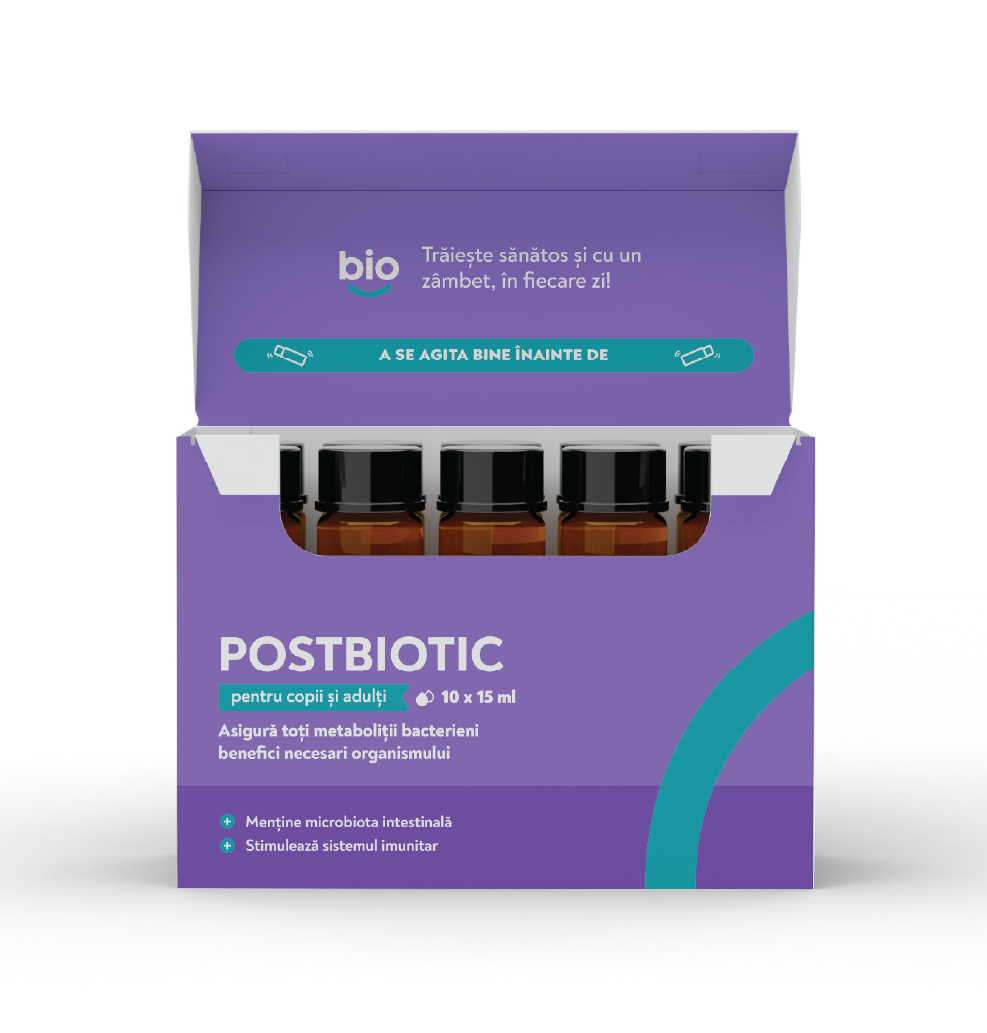 Postbioticul Bibiotic® pentru copii și adulți este un produs 100% natural, obținut în mod natural din tulpini bacteriene probiotice intestinale selectate. Conține toți metaboliții naturali, nepurificați, secretați și sintetizați de acestea, precum și lizatele lor (bacterii ucise intenționat) și componentele lor celulare (particule celulare, particule din pereții celulari și bioproduse celulare).