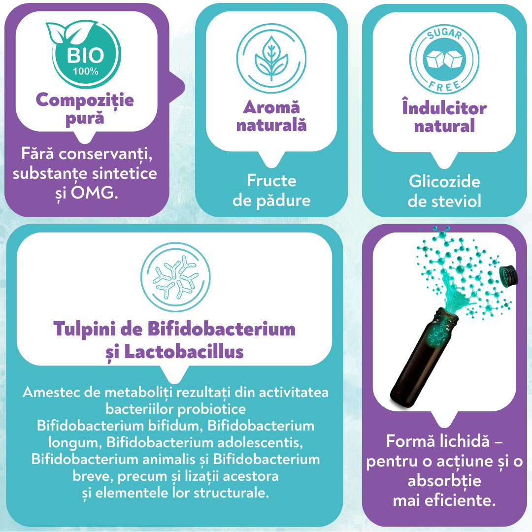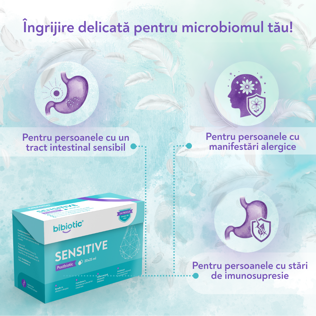 Prin îmbunătățirea barierei intestinale, Bibiotic® Sensitive contribuie la reducerea pătrunderii alergenilor în fluxul sanguin. Acesta îmbunătățește echilibrul bacteriilor noastre benefice, ajutând organismul să combată mai eficient alergenii și să reducă frecvența și intensitatea reacțiilor alergice. Microbiomul intestinal sănătos are un rol esențial în reglarea răspunsului imunitar, reducând probabilitatea apariției reacțiilor alergice. Bibiotic® Sensitive reglează producția de anticorpi și molecule inflamatorii, ceea ce este esențial pentru ameliorarea simptomelor alergiilor. Iar capacitatea sa de a reduce hipersensibilitatea sistemului imunitar, diminuând nivelurile de citokine inflamatorii, care va contribui la reacțiile corecte ale pielii legate de alergii.